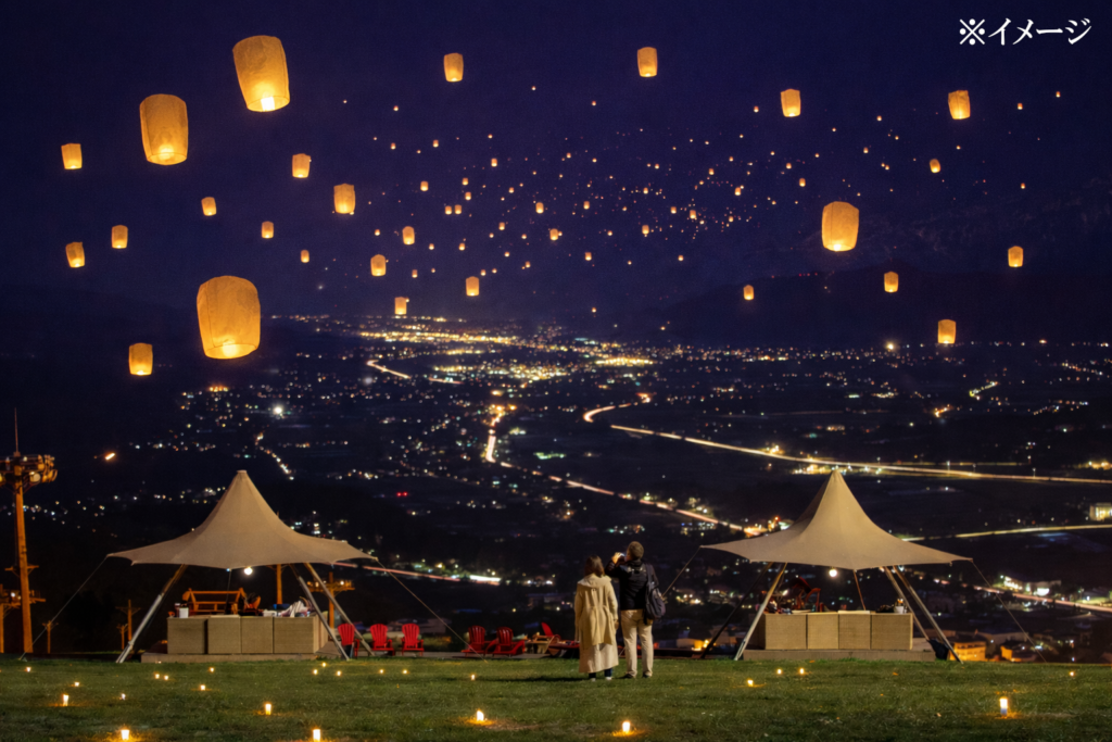 ナイトテラス営業日限定で、LEDスカイランタンのフォトスポットが登場し、夜景の雰囲気を一層盛り上げます。