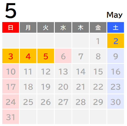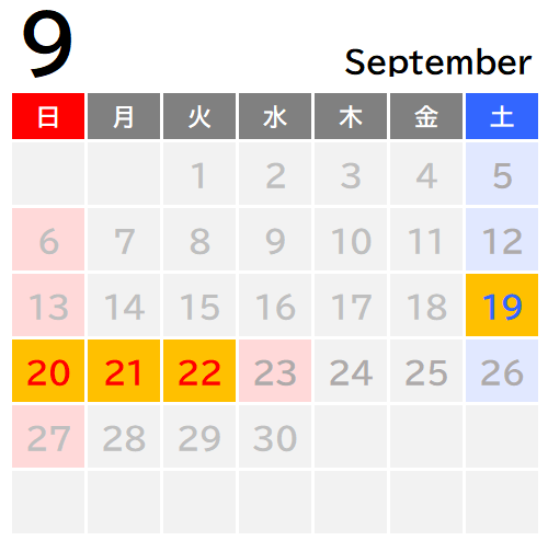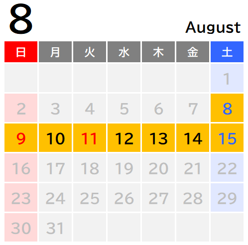 2026年5月2日(土)〜5日(火祝)、8月8日(土)~15日(土)、9月19日(土)〜22日(火祝)